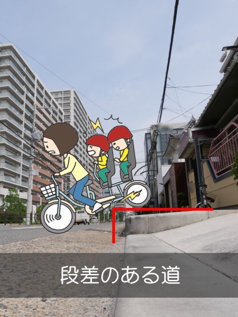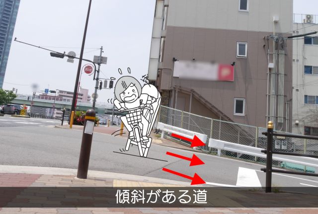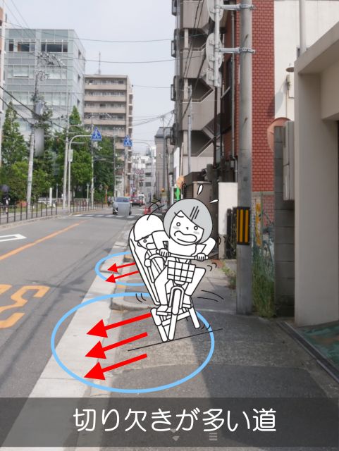 ・傾斜がある道 ・でこぼこ道 ・段差のある道 ・切り欠きの多い歩道 ・人とすれ違えないほどの狭い歩道 ・電柱やフェンスがある道