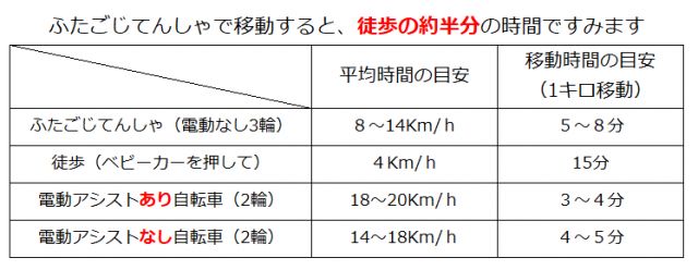 以下にあげた時間の目安は、平坦な道での場合です。坂道や、道路状況がよくなければ移動時間もかわります。