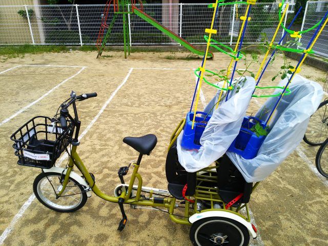 わが家のふたごじてんしゃ、子供たちを乗せず、植木鉢を座らせてもってったよ。